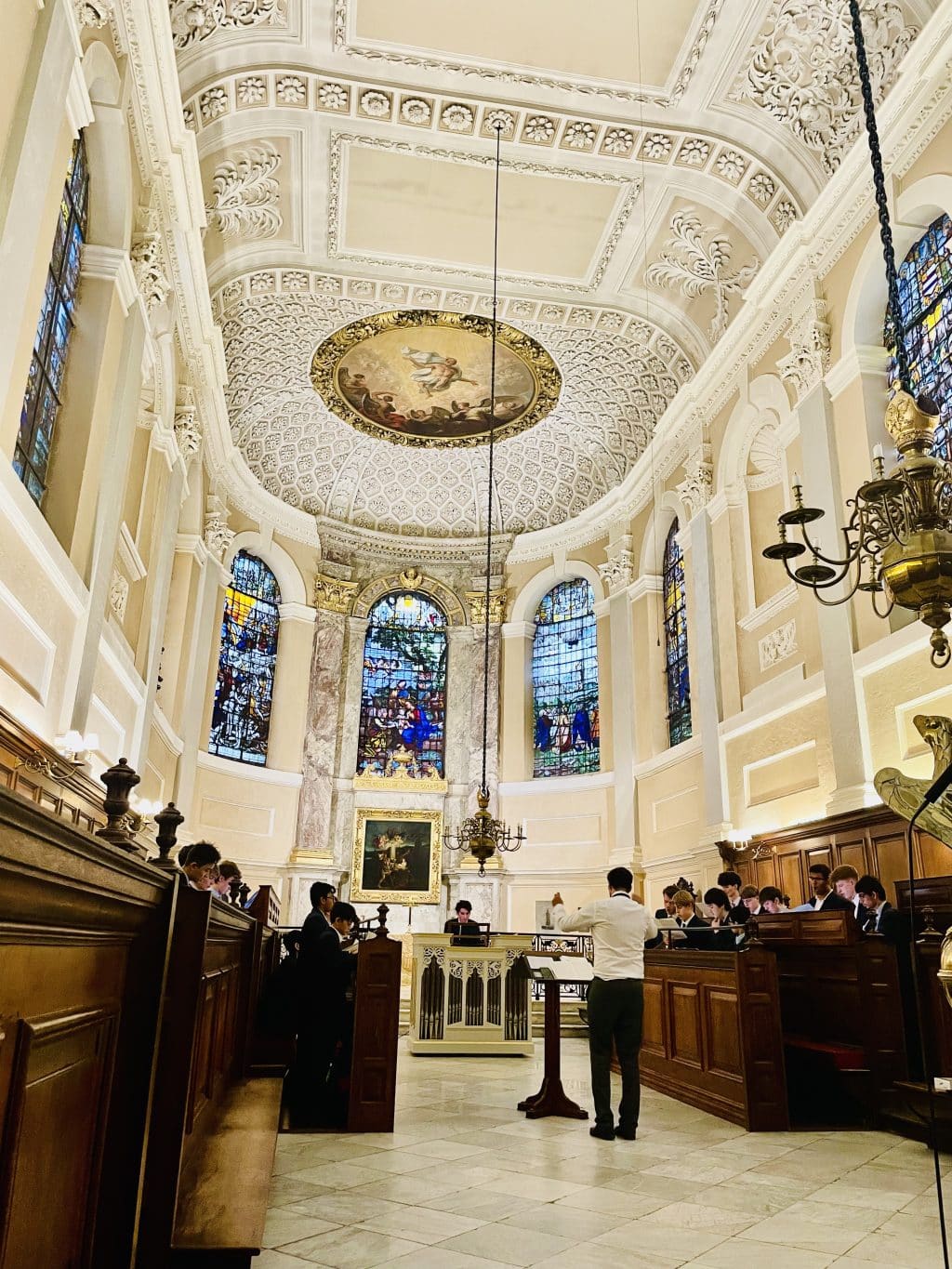 It was a delight to return to the Chapel of the The Queens’ College in Oxford to sing choral evensong. This was the first performance of the year for the Chamber Choir and it was wonderful to perform in such a beautiful and acoustically rewarding setting. It was a busy service, opening with Gibbons’ ‘Almighty and everlasting God’ as the introit. Following responses by Ayleward and a psalm, the choir performed Purcell in G Minor as the canticles. There were lovely solos for Alexander, Tom, and Micky whilst it was a delight to be accompanied on the Chamber organ by Mr Morrin. Our anthem for the evening was Wesley’s ‘Thou wilt keep him in perfect peace’, a gentle and reflective anthem sung with clarity and nuance. Following a brief homily from the chaplain, there was time for a hymn for St Michael’s and All Angels, ‘Angel Voices ever reigning’. We are very grateful to the college and chapel for allowing us to visit and do hope to return in the future.