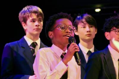 Lower School gathered in the Amey Theatre on the final day of the first half of term for the annual inter-tutor group music competition. Each tutor group performed a song that they had been working on for the last few weeks. A wide array of instruments were on display providing accompaniment, all the groups were conducted by one of their own, and there were impressive vocal performances by soloists and choruses. A high level of musicianship was shown by all 6 groups and Mr Stafford had a difficult job as judge, but awarded the cup to 2P for their rendition of Save Your Tears by The Weeknd.