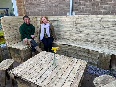 During the early Monday staff meeting, Katie was able to unveil a secret mission on a perfect sunny morning. A small outside space at the back of the staff room had been transformed into a communal seating area for a relaxing cup of coffee in the fresh air.