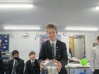 8R got all charged up as they studied static electricity – a topic which gives plenty of scope for fun practical work. For instance, they explored transferring charges to balloons via jumpers and hair in a contest to see whose balloon would stay on the ceiling longest. The most excitement and charge was generated by the Van der Graaf generator, which despite the air being a bit damp, managed to stand a lot of hair on end!