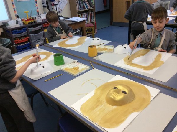 Year 3 have been exploring the final part of their Art In Egypt project this term, creating masks for mummies. Linking with history we learnt how to adorn their pharaohs death mask with collage patterns, gems and decoration. A very regal bunch.
