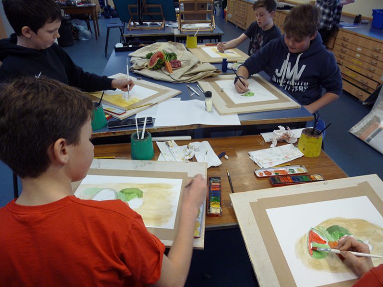 After a group discussion regarding the properties of watercolours, the Year 6,7 and 8 boys explored the many way we can manipulate the media. Adding, salt, drawing with candles to create a resist and using masking fluids to reverse the colour and it's application.