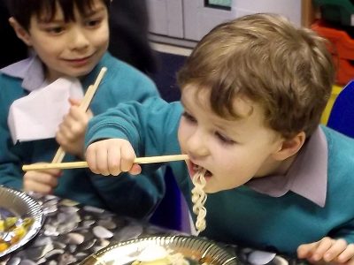 This week the boys in Reception explored some of the stories linked to the Chinese New Year Celebrations. The classroom came alive with the sound of drums and oriental music; a Chinese restaurant sprang up in our role play area, complete with our own hand-crafted lanterns; sculptures were made in rice; chopsticks were used to pick up items when counting, dragons were formed in red play-dough; the animals from the zodiac acted out the story in our garden; springy dragon puppets were crafted from scrap materials and Chinese numerals adorned the wall. Today we prepared our own Chinese meal.