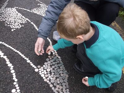 Over the last few weeks the boys have been collecting silver coins in preparation for constructing a large image of a horse’s head in support of our chosen charity for the year, Riding for the Disabled (RDA), which uses horses as a form of therapy for disabled children and young adults. A giant outline of a horse was chalked at the front of the school, before the pupils laid down their coins to create a wonderful image. We should be very proud of the sheer size of the horse and the coin counting must now begin!