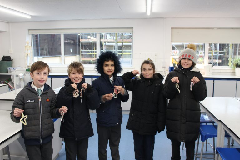In Science Club last week, the Year 5 boys made Christmassy shapes out of pipe cleaners and suspended them in saturated ‘alum’ solution. It doesn’t take long for the crystals to start growing and in a day or two, we were able to take them out of the solution to dry and harden up. They will now go home to be safely hung out of harm’s way.