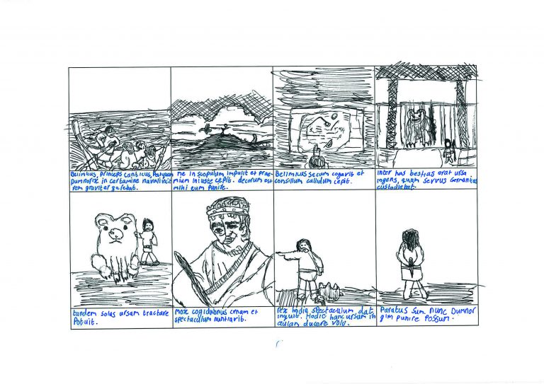Pupils at Abingdon Prep study passages from the Cambridge Latin Course. One of the texts tells the story of Dumnorix and Belimicus, two rival captains in a boat race. Belimicus was furious to have lost, and takes a bear to attack Dumnorix at the after-race party! Pupils created illustrated storyboards of the story in Latin, examples of which you can see below.