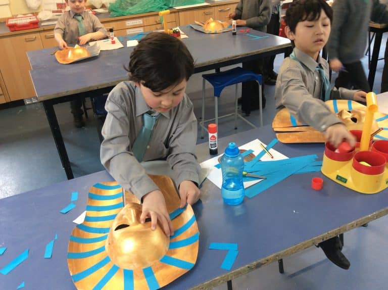 Year 3 has been exploring art in Egypt this term. Sketching canopic jars, painting portraits on papyrus and designing their own masks. Using collage, acrylic paints and making their own gems to adorn the mask, we couldn’t resist modelling them. What a scary bunch!