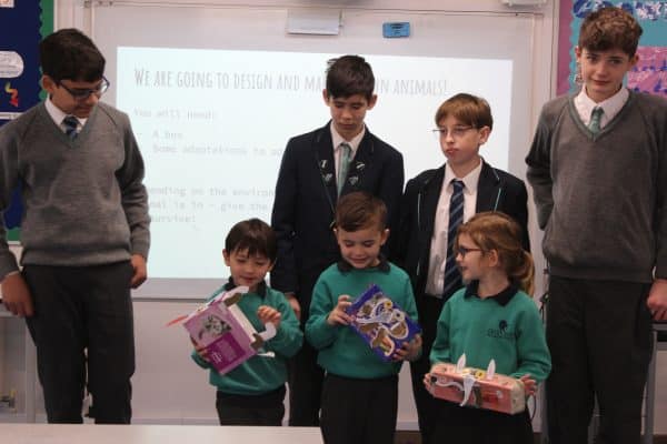 Reception pupils visited the Science Lab for a fun activity for Science Week. Divided into four teams for four different habitats (Arctic, marshland, woodland and desert), they made animals from boxes by adding features that would allow their animal to adapt to its environment: eyes, ears, arms, legs, noses, tails, trunks, claws, mouths – and eyebrows in one case! They were helped in this by some Year 8 pupils and together they had great fun making the animals. Then each group presented their animals to us, confidently describing all the features. Excellent work Reception!