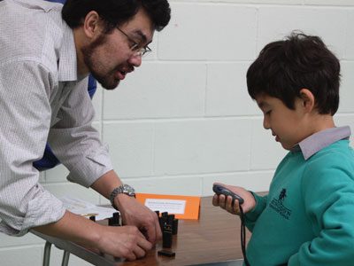 The sports hall was set up with skipping ropes, washing lines, bean bags, dice, connect 4, blocks and lots more equipment. Stopwatches were set out at each challenge and the children took their dads – and mums in some cases – around, both trying out the challenges and timing each other. The children were given score sheets to take with them to record their dad’s and their scores at each challenge.