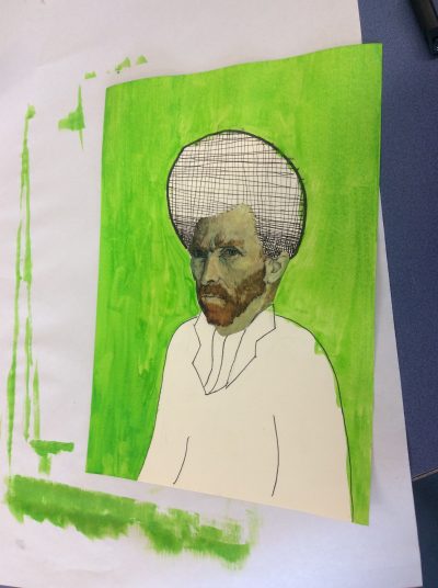 Year 5 and 6 art club has been experimenting with making marks, or zentangles, to create patterns using the portraits of some very famous artists. Much fun was had when restyling the hair of Van Gogh and the Mona Lisa, complemented in bold backgrounds using a specialist gouache matt paint for instant drama!