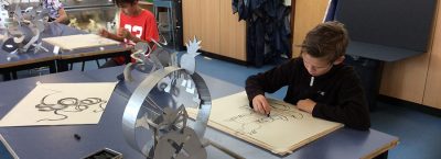 Saturday saw the first art workshop of the new academic year. Boys enjoyed constructing a free standing abstract sculpture using a slot to slot method so no glue or staples etc. They used silver painted cardboard so it looked like sheet metal.
