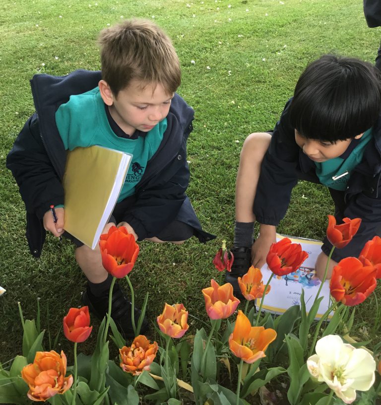 Year 2 children have been learning about the different parts of flowers in our Science lessons, including the different parts of the carpel and the stamen. This week, we took advantage of the good weather and went outside to explore the flowers growing in and around our school grounds. The children touched flowers and, seeing pollen on their fingers, acted as pollinators by touching other flowers with their pollen covered finger tips!