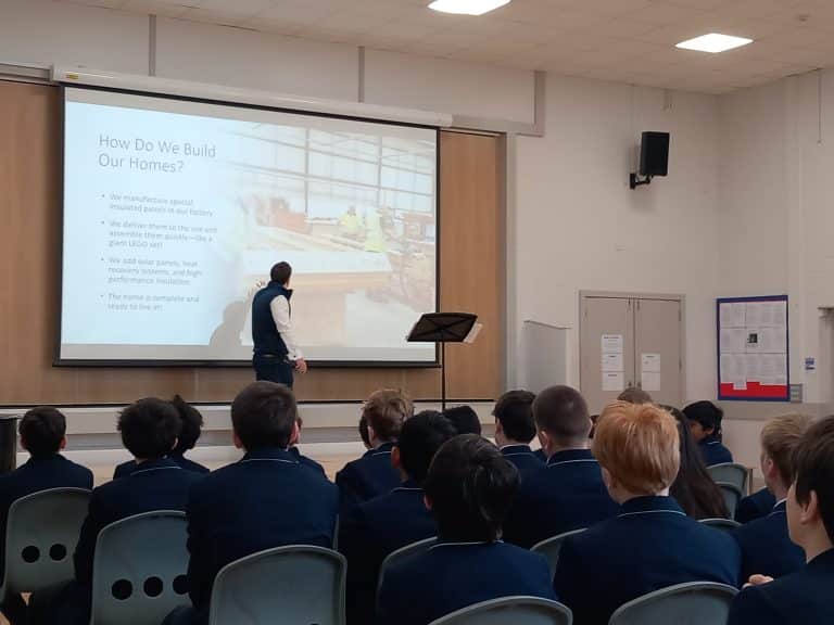 James Pritchett from Greencore Homes gave a talk to the Senior Section on sustainable housing, detailing how they build their homes to ensure that they have minimal energy loss and can therefore have a low impact on the environment. Pupils from 8R then took part in a workshop where they designed their own homes to be ‘eco friendly’ taking ideas from the presentation and also many of their own, including wind turbines and bee hives. James was as equally impressed with their ideas as they had been by his presentation. A super way to compliment Year 8s topic on energy.