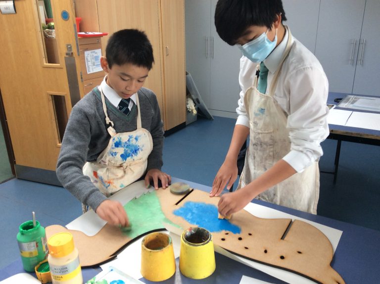 Waddesdon Manor, the Art Department and nine students from Years 7 and 8 have been working in collaboration to create a life sized sculpture of a wooden reindeer as a part of Illuminated River’s, ‘Bridges, Boats and Beyond’ project. We were assigned the painting ‘Swan Upping’ by the wonderful artist Stanley Spencer, which highlights life and tradition on the River Thames. The boys took part in a Zoom meeting with the Head of Learning at Waddesdon where she outlined the brief. The boys flew with ideas and decided that they wanted to create a collage of all their work based on the image we were given. The boys worked with individual paintings, digital manipulation and enlarged studies of key areas of Spencer’s image.