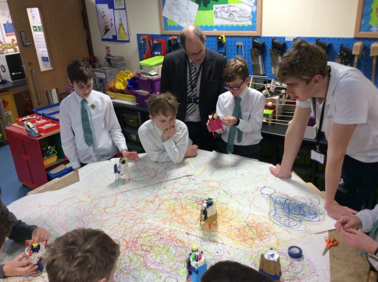 29 January 2020 Year 7 has created simple robot Jitterpens to draw circles across giant pieces of paper. The simple off-set 5g weight on the motor caused the Jitterpen to jump which Craig found fascinating on his visit to the CDT room last week.