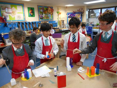 Year 7 boys have been entertaining the Pre-Prep in the CDT room this term. They made some simple moving toys for the younger boys to play with. Firstly they produced some colourful ‘Jitterbugs’, which moved using a simple electric circuit with an off-centre weight on the motor. Having understood the concept, they used recycled products such as paper cups and old felt tips to make a ‘Jitterbug’. On completion of the circuit by closing a switch, the Jitterbug jiggled its way across paper and if balanced, it made a circular pattern on paper. The Pre-Prep boys will now have to wait to see the results of the Year 7’s next project. They are busy cutting, heating and bending acrylic to use as a base for a simple desk fan.