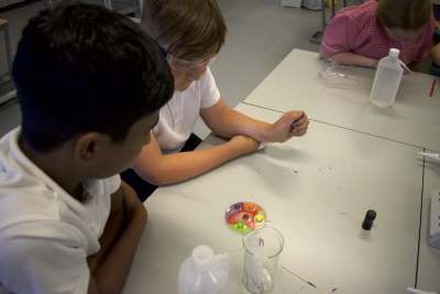 With the departure of the Upper 6th leavers, it has fallen to a brand new team of senior science ambassadors to inherit the responsibility of planning and running the weekly Primary Science Club for children from local schools. For their first session, the science ambassadors planned a forensics activity to identify a mystery ink using chromatography. Following completion of this task, the visiting primary children were then able to create imaginative artistic patterns using ‘Skittles’ sweets as sources of colour and predicting how the colours might spread and mix to make the most attractive patterns. Next week a second team of Science Ambassadors is planning a session focussed on eyes and vision. Watch this space for further insights!