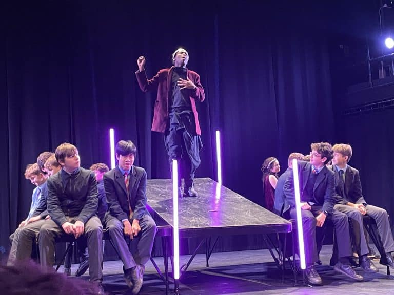 As part of their study of Macbeth, Fourth Year English Literature students witnessed a dynamic and interactive production of the Shakespearean tragedy, performed by the Box Clever Theatre company. This was followed by a workshop exploring the ways in which Macbeth is influenced to kill, featuring some skilful swordplay from enthusiastic student volunteers!
